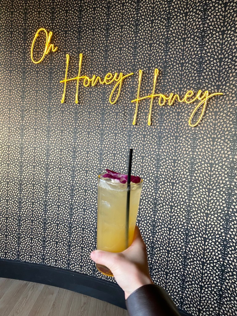 Hay tantas opciones de asientos, un bar extranjero con perspicacia al horizonte, un bar extranjero con perspicacia al interior de Beeline y un bar en el interior de Beeline con perspicacia al horizonte. Por supuesto, encontrará un asiento aquí, que puede organizar según el clima o sus preferencias. El sol se estaba poniendo y hacía frío fuera, así que decidimos sentarnos adentro con perspicacia al río. El interior era una mezcla de flamante y clásico, con asientos de terciopelo, letreros de neón y detalles dorados.