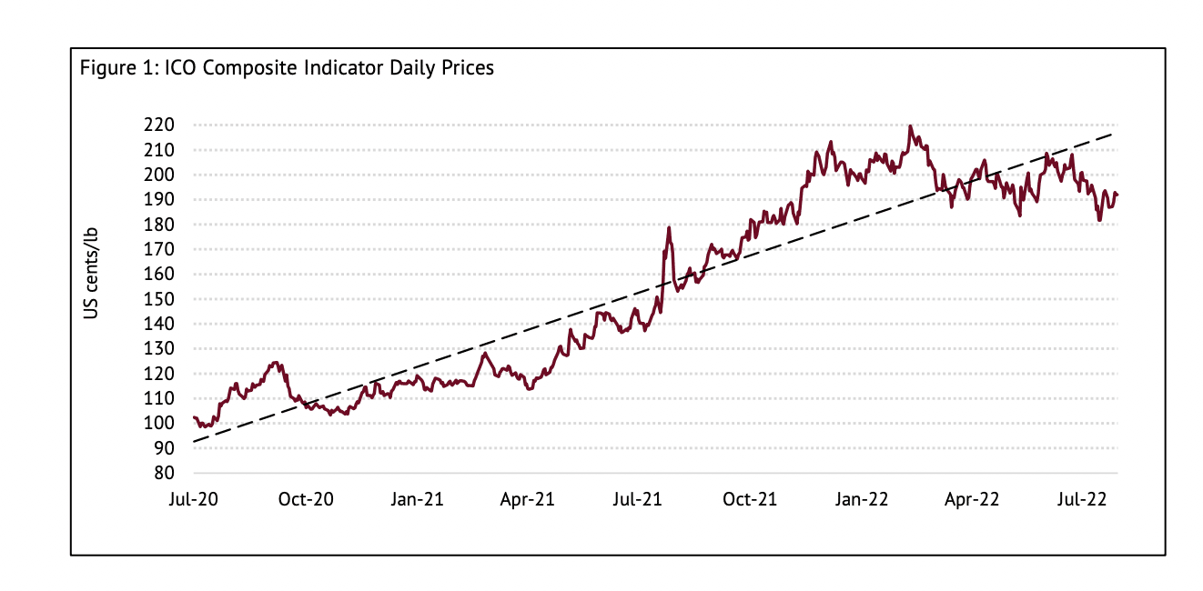 El documentación de mercado de la Ordenamiento Internacional del Café (ICO) de julio de 2022 muestra que el indicador compuesto de precios del café (I-CIP) cayó un 5,7 por ciento de junio a julio de 2022, con un promedio de 190,82 centavos de dólar estadounidense por libra.
