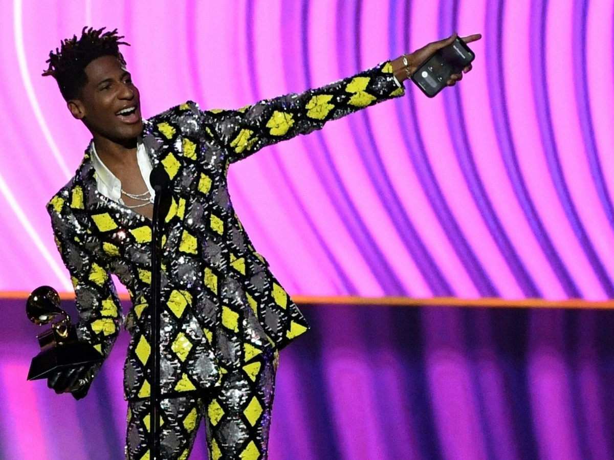 Jon Batiste accepts the trophy for best music video during the 64th Annual Grammy Awards in Las Vegas on April 3, 2022.