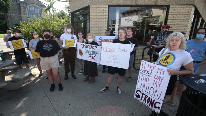 Los trabajadores de Heine Brother's Coffee protestaron después de que ayer se cerró permanentemente en su ubicación de Douglas Loop.  1 de julio de 2022